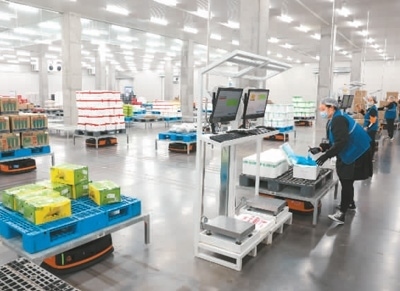 2月27日,在湖北省襄陽市好鄰居生鮮物流中心,機(jī)器人根據(jù)工作人員指令穿梭于貨架之間,自動分揀蔬菜、水果等生鮮產(chǎn)品。楊 東攝(人民視覺)