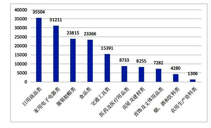 從商品和服務(wù)類別來看,在所有投訴中,商品類投訴為159143件,占總投訴量的52.32%,與去年同期相比,比重上升0.29個百分點;服務(wù)類投訴為137726件,占總投訴量的45.28%,比重上升0.87個百分點;其他類投訴為7290件,占總投訴數(shù)量的2.40%。