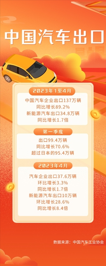 中國汽車工業(yè)協(xié)會(huì)的統(tǒng)計(jì)數(shù)據(jù)顯示,今年第一季度,國內(nèi)汽車企業(yè)出口99.4萬輛,同比增長70.6%,超過日本的95.4萬輛。最新數(shù)據(jù)顯示,4月份,出口37.6萬輛,同比增長1.7倍,其中,電動(dòng)、混動(dòng)等新能源汽車出口10萬輛,環(huán)比增長28.6%,同比增長8.4倍,保持良好勢(shì)頭。