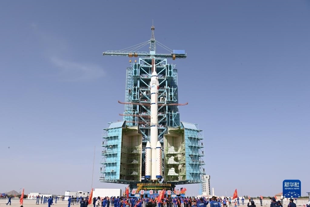5月22日,神舟十六號(hào)載人飛船與長(zhǎng)征二號(hào)F遙十六運(yùn)載火箭組合體轉(zhuǎn)運(yùn)至發(fā)射塔架。新華社發(fā)(汪江波 攝)
