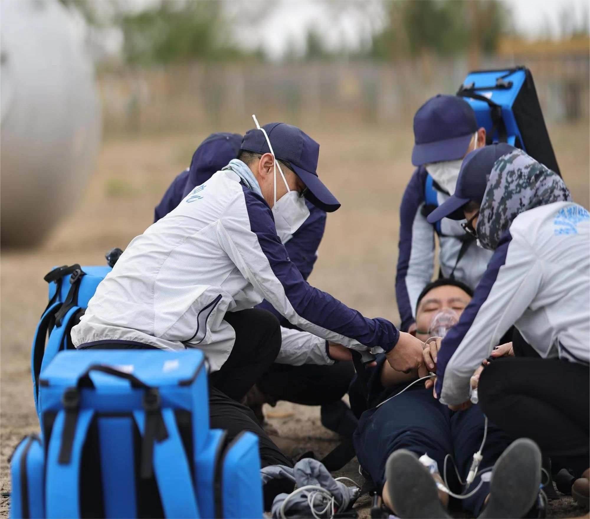 醫(yī)學急救“白金10分鐘、黃金1小時”,針對可能出現(xiàn)的飛船返回偏離落點,落在沙漠、山地、湖泊,搜救直升機無法降落,車輛無法進入的情況,為快速到達著陸地點,醫(yī)療救護隊員每天隨身攜帶艙前急救設備堅持訓練六七個小時,負重在沙漠、山地中奔跑,爭取最短時間展開緊急救治。夏日戈壁驕陽似火,風沙彌漫,訓練一天下來,隊員們耳朵眼里都是沙土,臉上脖子全是泥印,一個個都成了泥人。茫茫大草原記錄了神舟載人飛行任務醫(yī)療隊員們一次次醫(yī)療救護空地協(xié)同演練、全域協(xié)同演練的身影……