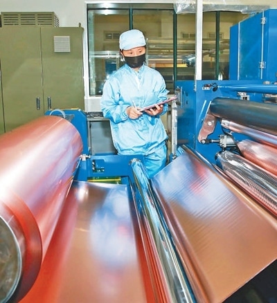 工人在銅陵有色銅冠銅箔有限公司車間內工作。高凌君攝