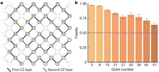 利用“祖沖之二號”完成的51比特一維簇態(tài)制備的線路及量子態(tài)保真度結果。(研究團隊供圖)