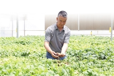 定西馬鈴薯研究所負責(zé)人李進福在查看馬鈴薯原原種長勢。本報記者 王錦濤攝