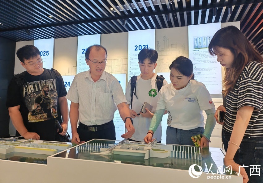 采訪團在西部陸海新通道南寧國際鐵路港展廳內(nèi)采訪。人民網(wǎng) 嚴立政攝