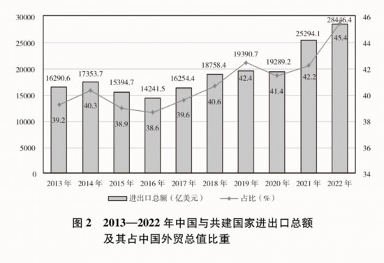 貿(mào)易投資規(guī)模穩(wěn)步擴(kuò)大。2013-2022年,中國與共建國家進(jìn)出口總額累計(jì)19.1萬億美元,年均增長6.4%;與共建國家雙向投資累計(jì)超過3800億美元,其中中國對外直接投資超過2400億美元;中國在共建國家承包工程新簽合同額、完成營業(yè)額累計(jì)分別達(dá)到2萬億美元、1.3萬億美元。2022年,中國與共建國家進(jìn)出口總額近2.9萬億美元,占同期中國外貿(mào)總值的45.4%,較2013年提高了6.2個百分點(diǎn);中國民營企業(yè)對共建國家進(jìn)出口總額超過1.5萬億美元,占同期中國與共建國家進(jìn)出口總額的53.7%。