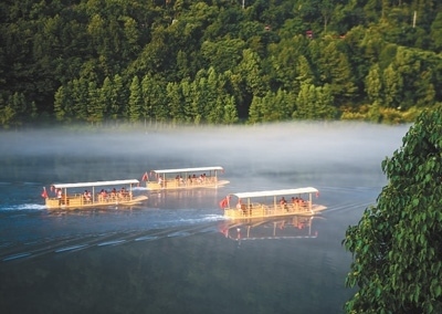 游客乘坐游船在新安江的江霧中前行。2012年浙皖兩省建立新安江流域生態(tài)補(bǔ)償機(jī)制試點(diǎn),新安江成為全國(guó)跨區(qū)域生態(tài)文明治理樣板。山水相連、河湖相通、生態(tài)相依,三省一市持續(xù)探索跨界治水、流域共治,筑牢生態(tài)基底、推動(dòng)綠色發(fā)展。新華社記者 徐 昱攝