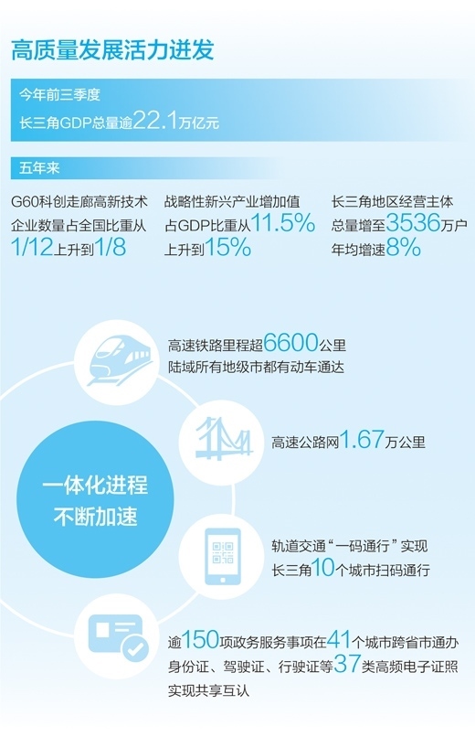 今年前三季度,長(zhǎng)三角GDP總量逾22.1萬(wàn)億元,占全國(guó)GDP總量比重較2022年同期有所提升,三省一市經(jīng)濟(jì)增速均超過(guò)了全國(guó)平均水平;作為長(zhǎng)三角一體化發(fā)展國(guó)家戰(zhàn)略的先手棋和突破口,長(zhǎng)三角生態(tài)綠色一體化發(fā)展示范區(qū)掛牌以來(lái),共形成136項(xiàng)務(wù)實(shí)有效的制度創(chuàng)新成果,其中38項(xiàng)已面向全國(guó)復(fù)制推廣;已有逾150項(xiàng)政務(wù)服務(wù)事項(xiàng)可在長(zhǎng)三角41個(gè)城市跨省市通辦,實(shí)現(xiàn)身份證、駕駛證、行駛證等37類高頻電子證照的共享互認(rèn)……