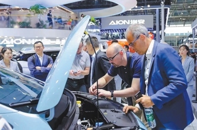 外國(guó)觀眾在北京車展廣汽埃安展臺(tái)參觀。王子牧攝
