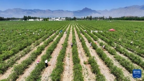 6月12日,采摘工在枸杞地里采摘枸杞(無人機照片)。