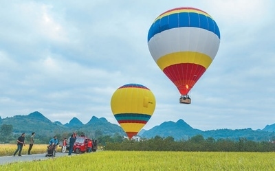 10月6日,湖南寧遠縣灣井鎮(zhèn)十里畫廊,游客乘坐熱氣球觀賞田園美景。蔣克青攝(人民視覺)