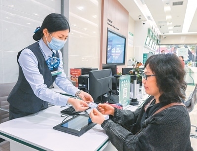 “社保服務事項進銀行”是重慶市社會保險局創(chuàng)新推出的一項公益服務,合作銀行通過所有人工服務網(wǎng)點、智能自助服務終端以及手機銀行App,向群眾免費提供社保服務。圖為中國農(nóng)業(yè)銀行重慶沙坪壩天星橋支行,工作人員為市民辦理相關(guān)社保業(yè)務。孫凱芳攝(人民視覺)