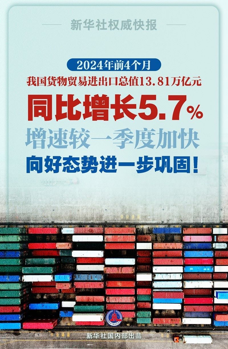 同比增長5.7%,前4個(gè)月我國外貿(mào)增速加快 海關(guān)總署5月9日發(fā)布數(shù)據(jù)今年前4個(gè)月我國貨物貿(mào)易進(jìn)出口......
