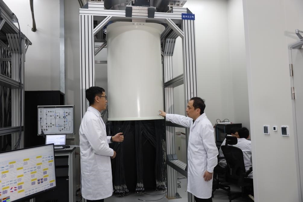 3月3日,中國科學(xué)技術(shù)大學(xué)教授、“祖沖之號”量子計(jì)算總師朱曉波(右)與學(xué)生討論制冷機(jī)狀態(tài)。新華社發(fā)(代蕊攝)