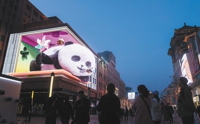 北京市王府井步行街百貨大樓墻體,裸眼3D大屏畫面吸引人們觀看。
