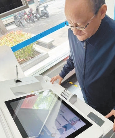 老年客戶使用智能柜員機(jī)辦理業(yè)務(wù)。