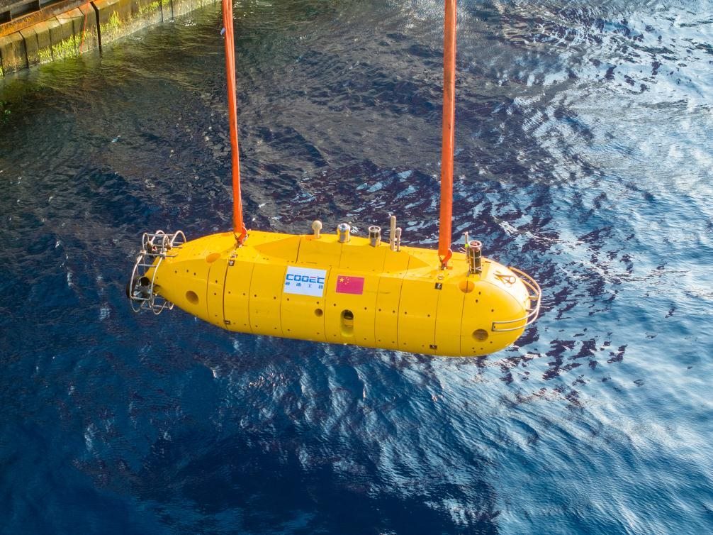 我國(guó)自主研發(fā)深水海管鋪設(shè)智能監(jiān)測(cè)裝備“海衛(wèi)”系統(tǒng)水下自主遙控機(jī)器人進(jìn)行入海測(cè)試。(海油工程供圖)