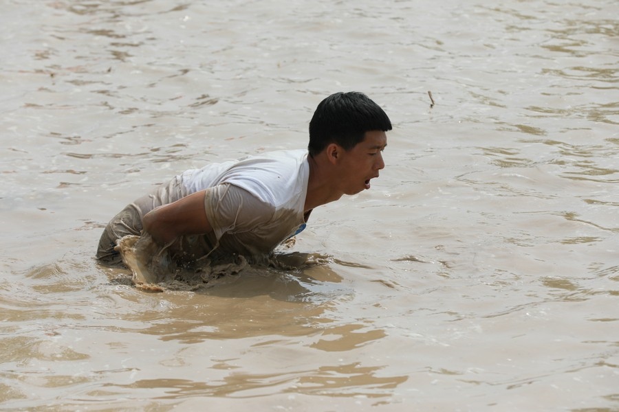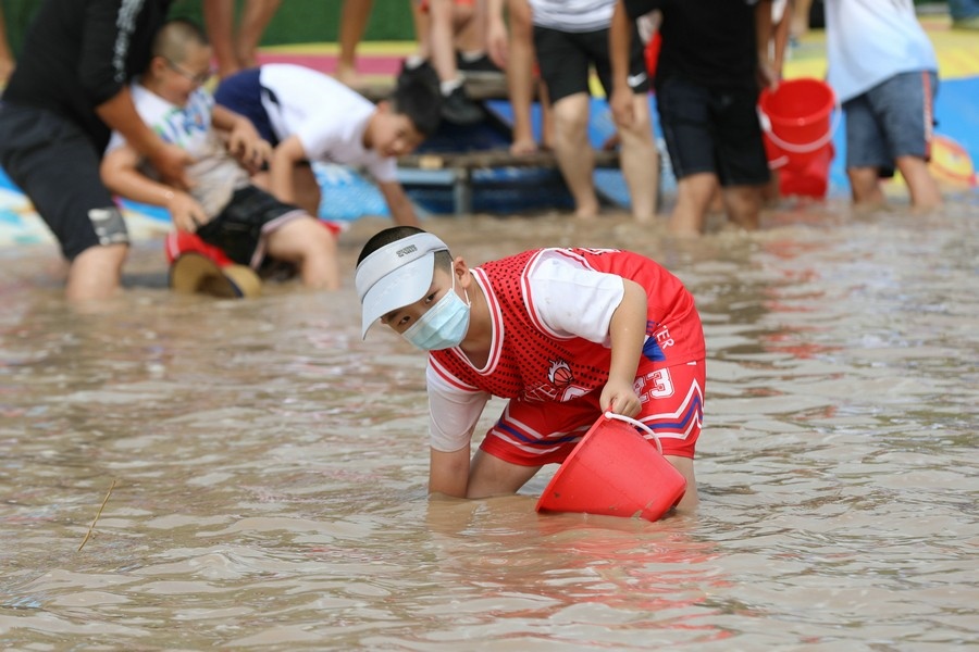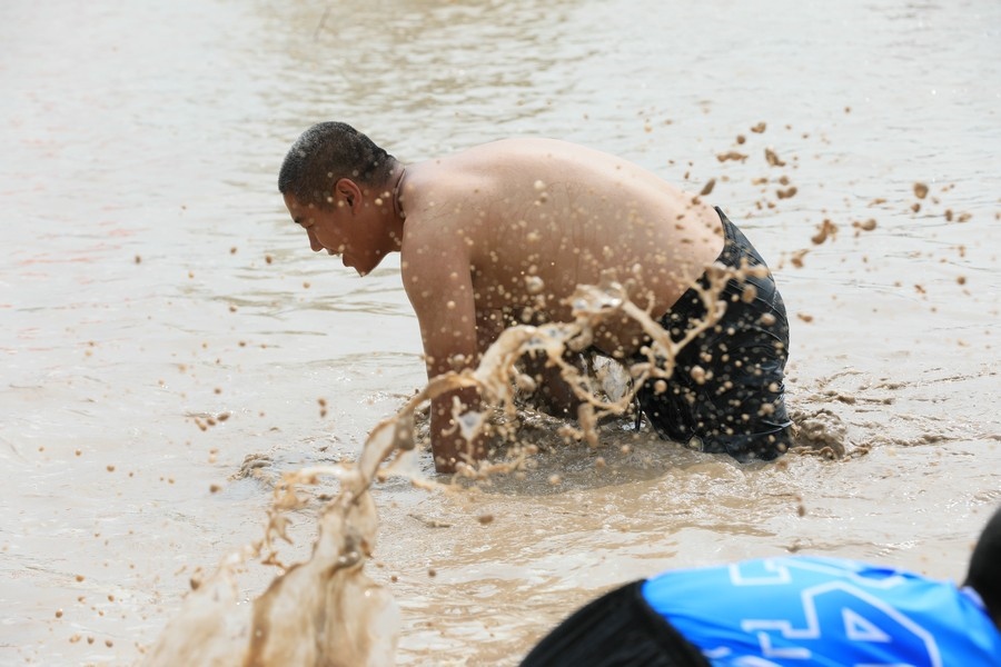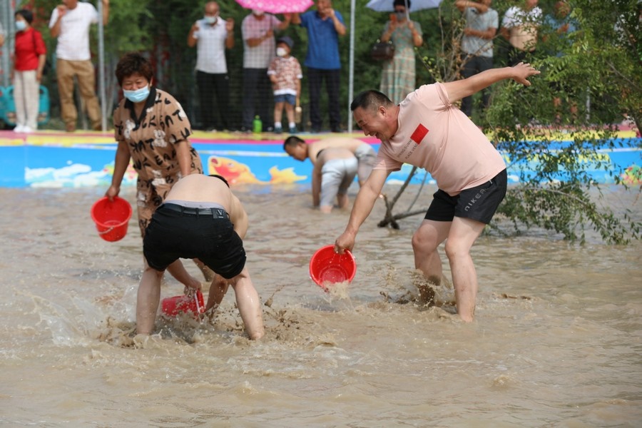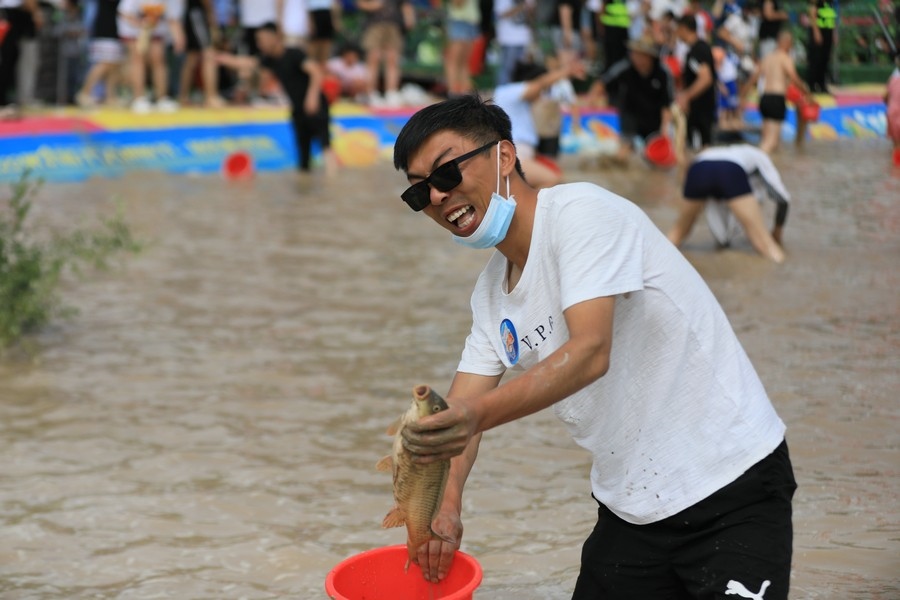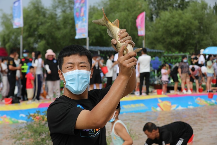 隨著主持人的一聲號令,來自呼和浩特市區(qū)和土默特左旗的眾多參與者,挽起褲管,光著腳丫,沖進池塘,展開了一場摸魚大比拼。