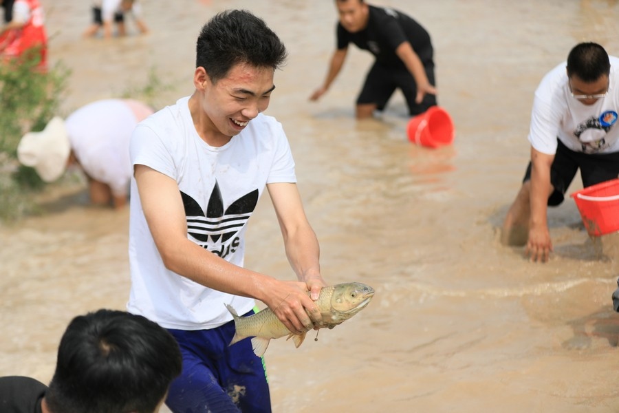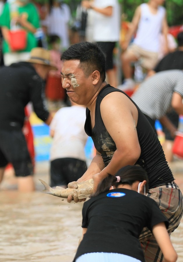 “抓到了,好大一條!”一位男士從池塘中抓到了一條1米多長的大魚,旁邊眾多參與者紛紛投來羨慕的目光。