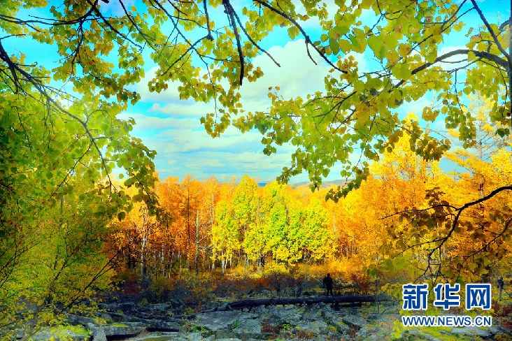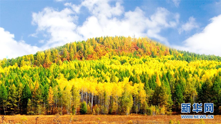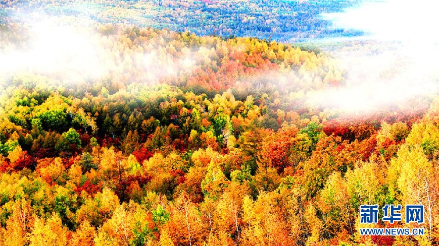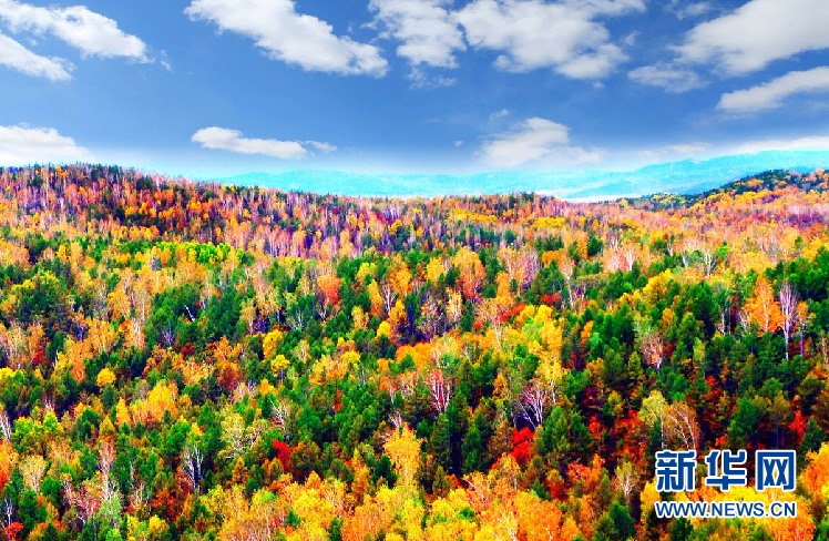 松樹林、白樺林、柞樹林和一片片混交林“染”成不同色彩,茫茫林海宛若一幅匠心獨運的繽紛畫卷。(9月28日攝)新華網(wǎng)發(fā)(欒維敬 攝)