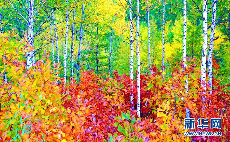 一陣秋風(fēng)吹過,松樹、白樺、柞樹齊抖葉片,一叢深、一叢淺,綠葉點點映著黃葉,層林盡染,似一幅幅鋪天蓋地潑彩的油畫。(9月28日攝)新華網(wǎng)發(fā)(欒維敬 攝)