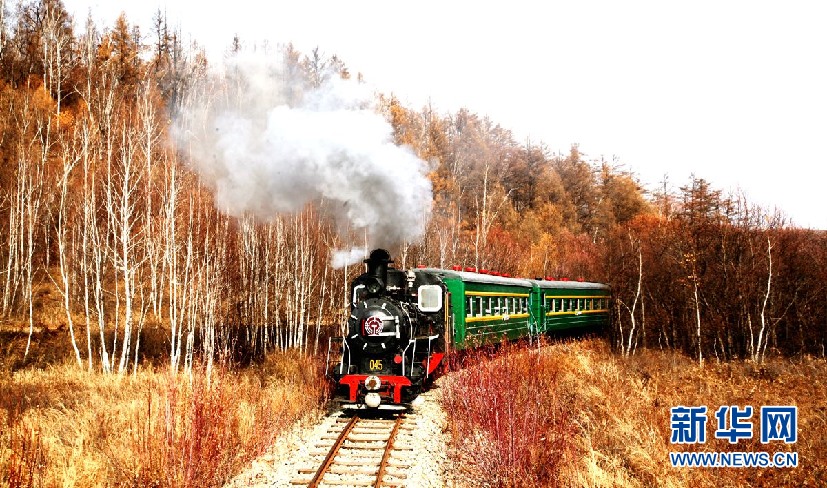 金秋時節(jié),在內(nèi)蒙古大興安嶺阿里河國家森林公園內(nèi),森林蒸汽機小火車帶領(lǐng)游客穿越秋季美景。(9月28日攝)新華網(wǎng)發(fā)(欒維敬 攝)