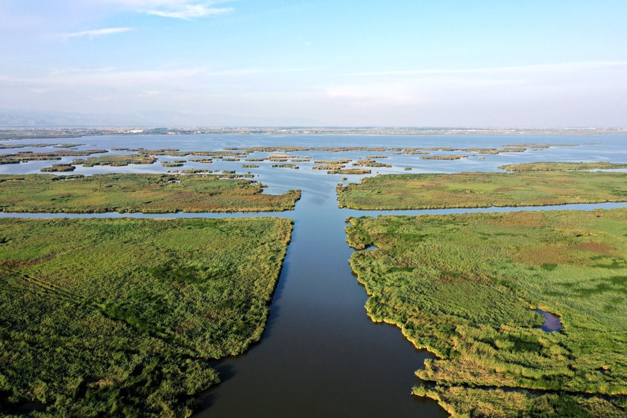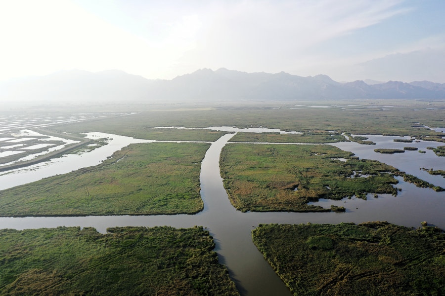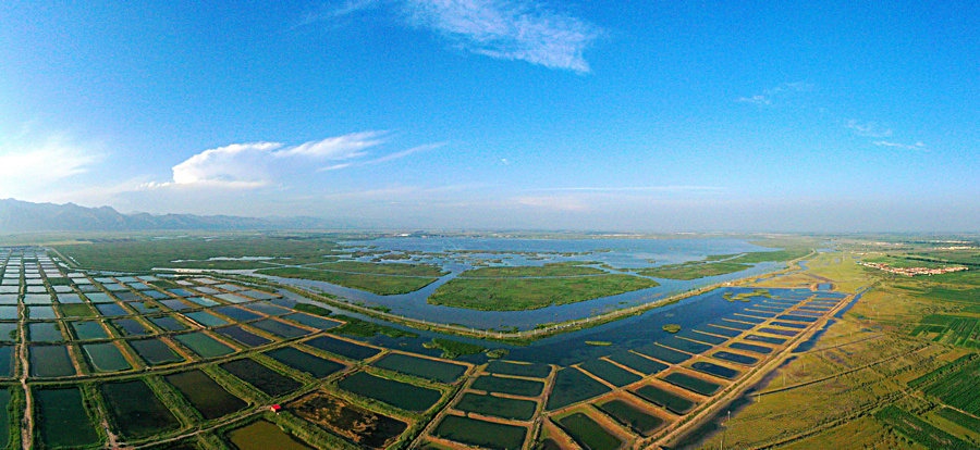 夏日的哈素海濕地,湖水清波蕩漾,水鳥嬉戲成群,山湖相映,一派生機(jī)。