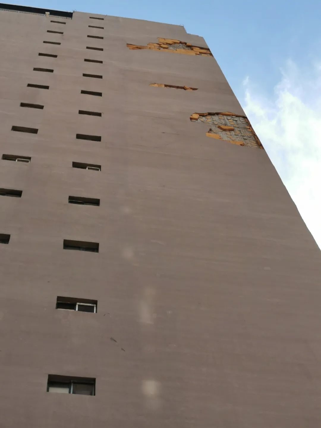 7月1日10時(shí)許,記者來(lái)到聞都雅苑4號(hào)樓下,抬頭望去,該棟樓西側(cè)墻壁有三處地方出現(xiàn)破損,大片的墻皮和里面的保溫層均已脫落。記者注意到,聞都雅苑共有4棟高層,該小區(qū)只有東西和南北兩條主干道以及西側(cè)一條小走廊,而4號(hào)樓正好位于南北主干道一側(cè)。據(jù)小區(qū)居民郝先生介紹,不斷掉落的保溫層已經(jīng)威脅到了居民的人身安全。今年5月6日,呼和浩特市出現(xiàn)大風(fēng)天氣,在風(fēng)力的作用下,4號(hào)樓東西兩側(cè)的外墻保溫層出現(xiàn)大面積脫落,一位恰巧路過(guò)4號(hào)樓西側(cè)的女性業(yè)主不幸被掉落的材料砸中,導(dǎo)致腿部受傷,此事也給小區(qū)居民帶來(lái)了恐慌。