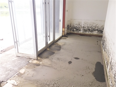 積水路面東側(cè)是已經(jīng)處于廢棄狀態(tài)的白廟子公安檢查站,檢查站內(nèi)外均殘留著被水泡過的痕跡。7月8日深夜,呼和浩特又降大雨。9日,記者再次來到緯五路看到,路面上的積水已經(jīng)蔓延到了檢查站樓內(nèi)。樓內(nèi)一片狼藉,從墻面上殘留的水印看,遭水淹最嚴(yán)重時(shí)樓內(nèi)積水深達(dá)五六十公分。