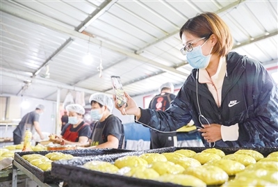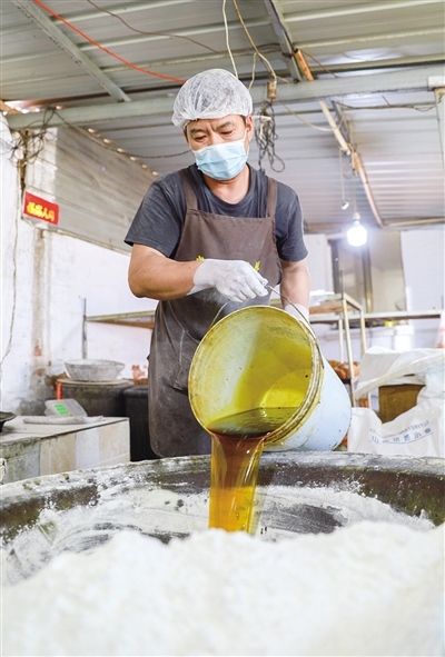“我們堅(jiān)持手工制作,就是想留住這個(gè)味道!”常三文是隆盛莊月餅制作技藝非遺傳承人,他帶記者來到了打月餅的作坊。一個(gè)約60平方米的房間里有兩個(gè)大鐵鍋,一個(gè)鐵鍋里熬著糖水,另一個(gè)鐵鍋用來和面。一名男工將面粉、熟胡麻油、糖水等按比例倒入鐵鍋,然后用鐵鏟攪拌起來。鐵鍋旁邊是一個(gè)做月餅的大案板,4個(gè)女工稱重、分劑、做胚、擺放,各自忙活著。常三文的兒子常曉峰負(fù)責(zé)將擺放好的月餅放進(jìn)燒爐火的烤爐,計(jì)時(shí)、下簽子、刷油……直至月餅烤制完成出爐。