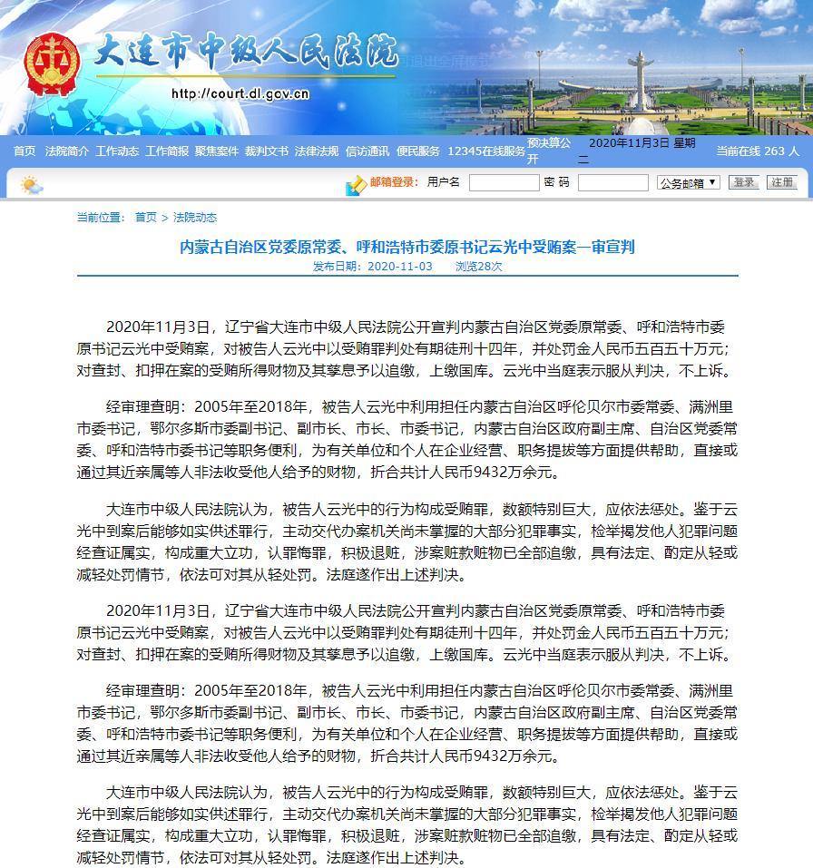 2020年11月3日,遼寧省大連市中級人民法院公開宣判內(nèi)蒙古自治區(qū)黨委原常委、呼和浩特市委原書記云光中受賄案,對被告人云光中以受賄罪判處有期徒刑十四年,并處罰金人民幣五百五十萬元;對查封、扣押在案的受賄所得財物及其孳息予以追繳,上繳國庫。云光中當(dāng)庭表示服從判決,不上訴。