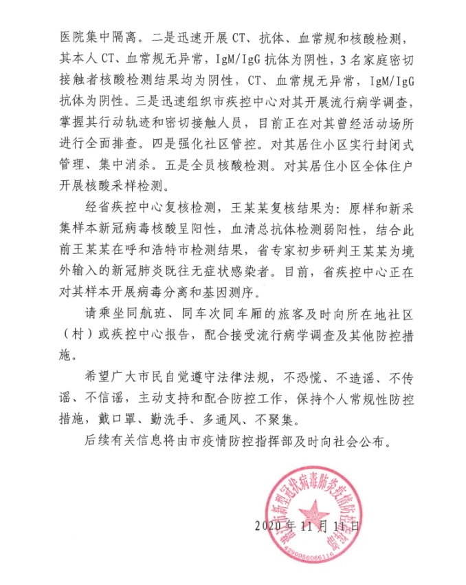 11月10日王某在潛江市核酸檢測結(jié)果陽性。為切實(shí)保障廣大市民身體健康,呼和浩特市疫情防控指揮部已對王某離呼前的密切接觸者和密切接觸者的密切接觸者全部落實(shí)了管控措施,后續(xù)工作按照相關(guān)要求正在有序進(jìn)行中。