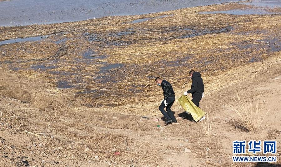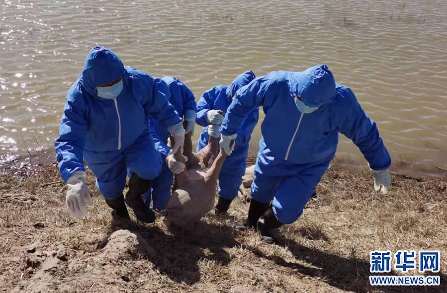 3月21日,當(dāng)?shù)卣块T派出的工作人員在達(dá)拉特旗黃河國堤內(nèi)收集死畜。新華社發(fā)