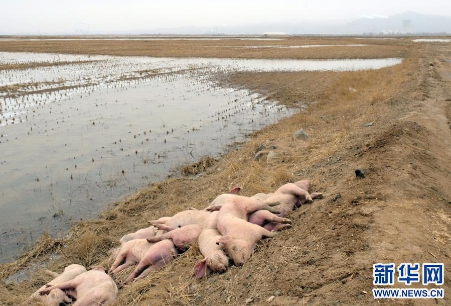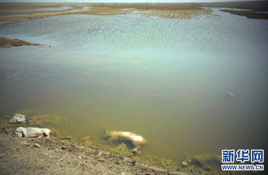 這是3月16日在達(dá)拉特旗黃河國堤內(nèi)拍攝的死豬。新華社記者 賈立君 攝