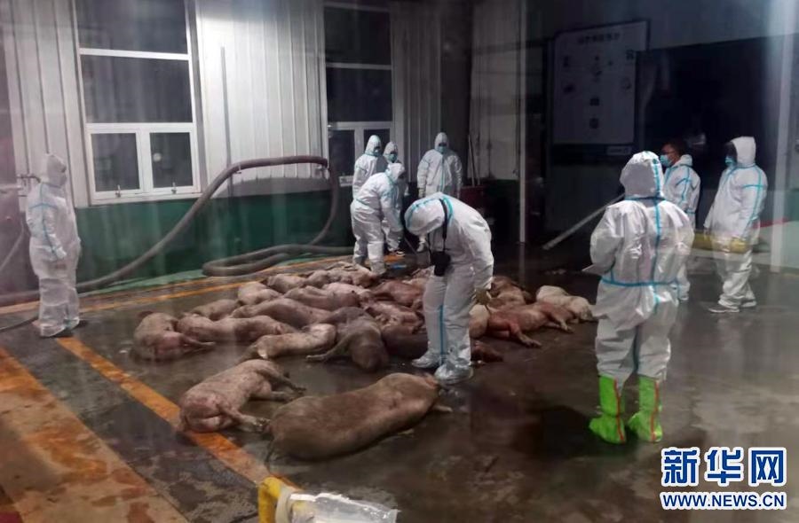 3月21日,工作人員在達(dá)拉特旗病死畜無害化處理中心對收集的死豬進(jìn)行無害化處理。新華社發(fā)