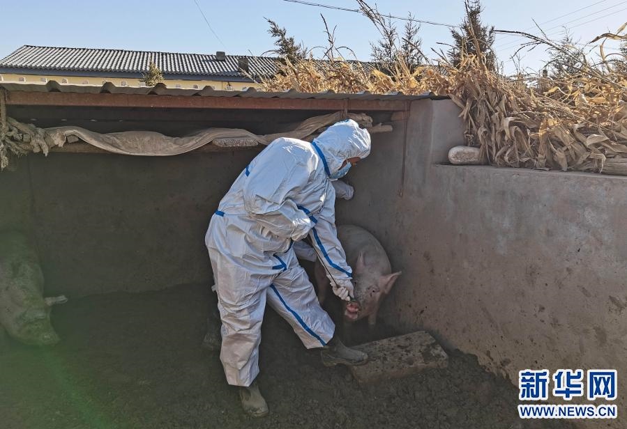 3月22日,達(dá)拉特旗疫控人員對農(nóng)戶養(yǎng)殖的生豬進(jìn)行檢測采樣。新華社發(fā)