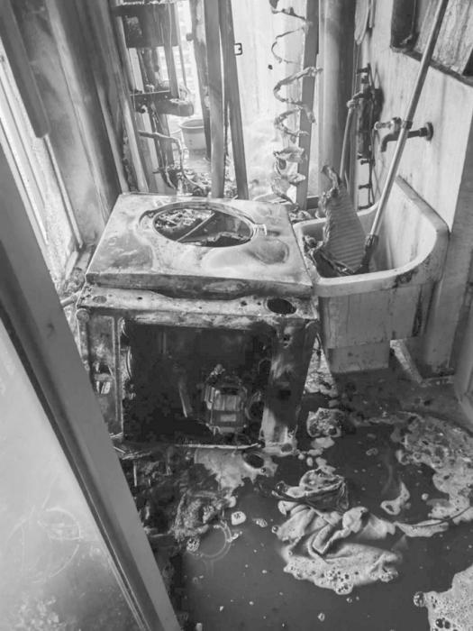 經(jīng)了解,起火點(diǎn)位于業(yè)主家的北陽臺(tái),業(yè)主將吹風(fēng)機(jī)開機(jī)對著陽臺(tái)水管吹了整整一夜,該吹風(fēng)機(jī)發(fā)生故障著火后引燃了堆積的雜物,洗衣機(jī)被燒得只剩下骨架,玻璃窗戶受熱后完全破碎,雜物悉數(shù)被燒,水管、墻面也被熏黑。