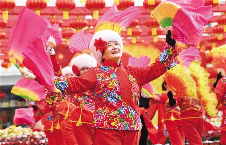2月14日,演員們?cè)趦?nèi)蒙古展覽館廣場(chǎng)上跳起歡快的舞蹈。當(dāng)日,內(nèi)蒙古展覽館開展“傳統(tǒng)文化月月傳”邀您一起鬧元宵活動(dòng)。記者 王磊 攝