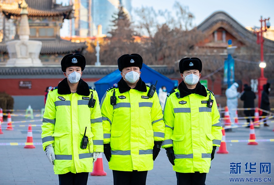 2月21日,在呼和浩特市玉泉區(qū)小召街道五塔寺廣場(chǎng)臨時(shí)核酸采樣點(diǎn),玉泉交管大隊(duì)民警在執(zhí)勤。新華網(wǎng)發(fā) (丁根厚 攝)