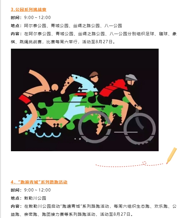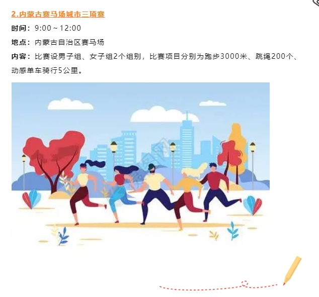本次運(yùn)動會認(rèn)真踐行“以人民為中心”辦賽理念,創(chuàng)新探索聚集少、規(guī)模小、符合大眾運(yùn)動口味的內(nèi)蒙古賽馬場城市三項(xiàng)賽,包含跑步3000米、跳繩200個(gè)和動感單車騎行5公里3個(gè)項(xiàng)目比賽。此外,還將舉辦公園系列挑戰(zhàn)賽、“跑遍青城”系列路跑活動等,讓群眾在暢享運(yùn)動的過程中盡情領(lǐng)略城市綠景的清新曼妙,進(jìn)一步推動全民健身與全民健康深度融合。