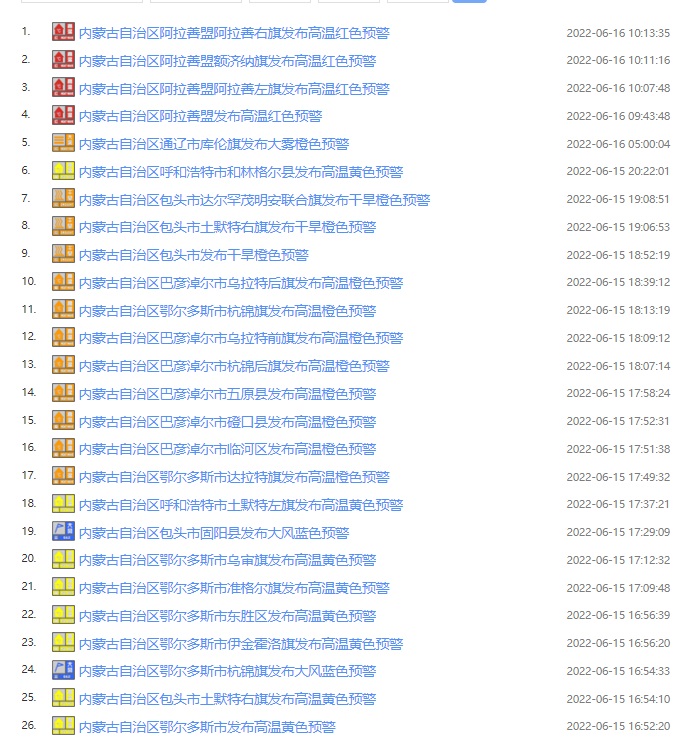 據(jù)內(nèi)蒙古氣象臺(tái)預(yù)計(jì),6月16~20日連續(xù)5天,內(nèi)蒙古西部及中部偏西大部地區(qū)(阿拉善盟、烏海市、巴彥淖爾市、鄂爾多斯市、包頭市、呼和浩特市等大部地區(qū))將迎來(lái)今年首次大范圍35℃以上高溫天氣,其中,西部部分地區(qū)最高氣溫將達(dá)37℃及以上,局地超過(guò)40℃;20~21日阿拉善盟高溫將逐漸減弱消失,而35℃以上高溫天氣向錫林郭勒盟西部延伸。