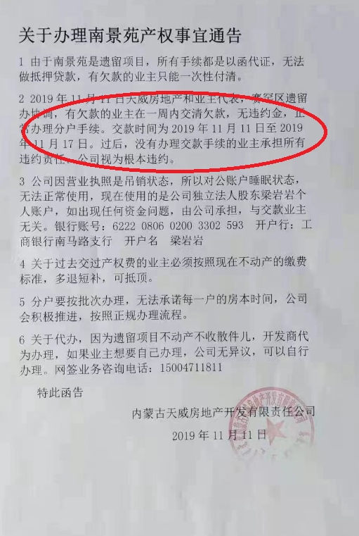 對于賈麗娟的說法,南景苑小區(qū)的居民告訴記者:“2019年11月11日,天威房地產(chǎn)公司曾在小區(qū)張貼過一則關(guān)于辦理南景苑產(chǎn)權(quán)事宜通告,公告中已經(jīng)明確,2019年11月11日天威房地產(chǎn)和業(yè)主代表、賽罕區(qū)遺留辦協(xié)調(diào),有欠款的業(yè)主在一周內(nèi)交清欠款,無違約金,正常辦理分戶手續(xù)。這充分說明了我們不需要在交納違約金暨滯納金,賈麗娟所說的滯納金明顯與當(dāng)年的通告內(nèi)容相違背。再說,天威房地產(chǎn)公司營業(yè)執(zhí)照處于吊銷狀態(tài),好多地方存在違約行為,按合同約定公司應(yīng)該賠償給居民的錢誰來負(fù)責(zé)?”(北方新報正北方網(wǎng)首席記者 高志華 實習(xí)生 張子椒)