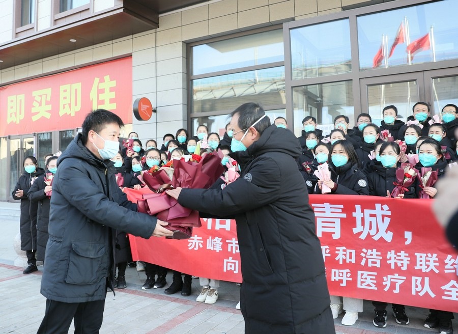 新華融媒、北疆新聞網(wǎng)消息(記者 張楊)“自呼和浩特疫情發(fā)生以來,50多個(gè)晝夜,白衣天使們逆行參戰(zhàn),奮戰(zhàn)在抗疫第一線,為呼和浩特保衛(wèi)戰(zhàn)貢獻(xiàn)了自己的力量,體現(xiàn)了白衣天使的責(zé)任和擔(dān)當(dāng),更展現(xiàn)了赤峰人奮勇拼搏的精神,圓滿完成了援呼醫(yī)療各項(xiàng)任務(wù),沒有辜負(fù)家鄉(xiāng)人民的重托,大家辛苦啦!”12月5日,在赤峰援呼普通病區(qū)醫(yī)療隊(duì)圓滿完成各項(xiàng)任務(wù),即將凱旋之際,赤峰市人民政府駐呼和浩特聯(lián)絡(luò)處和內(nèi)蒙古赤峰商會(huì),共同到醫(yī)療隊(duì)駐地看望醫(yī)療隊(duì)員。赤峰市人民政府駐呼和浩特聯(lián)絡(luò)處副主任李子輝,代表駐呼聯(lián)絡(luò)處和內(nèi)蒙古赤峰商會(huì)在呼和浩特地區(qū)鄉(xiāng)友,向援呼醫(yī)療隊(duì)領(lǐng)隊(duì)羅俊祥等醫(yī)護(hù)人員獻(xiàn)上鮮花和對(duì)家鄉(xiāng)同胞的親切問候。
