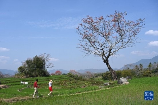 這是在海南昌江拍攝的梯田與木棉花(2月17日攝,無人機照片)。