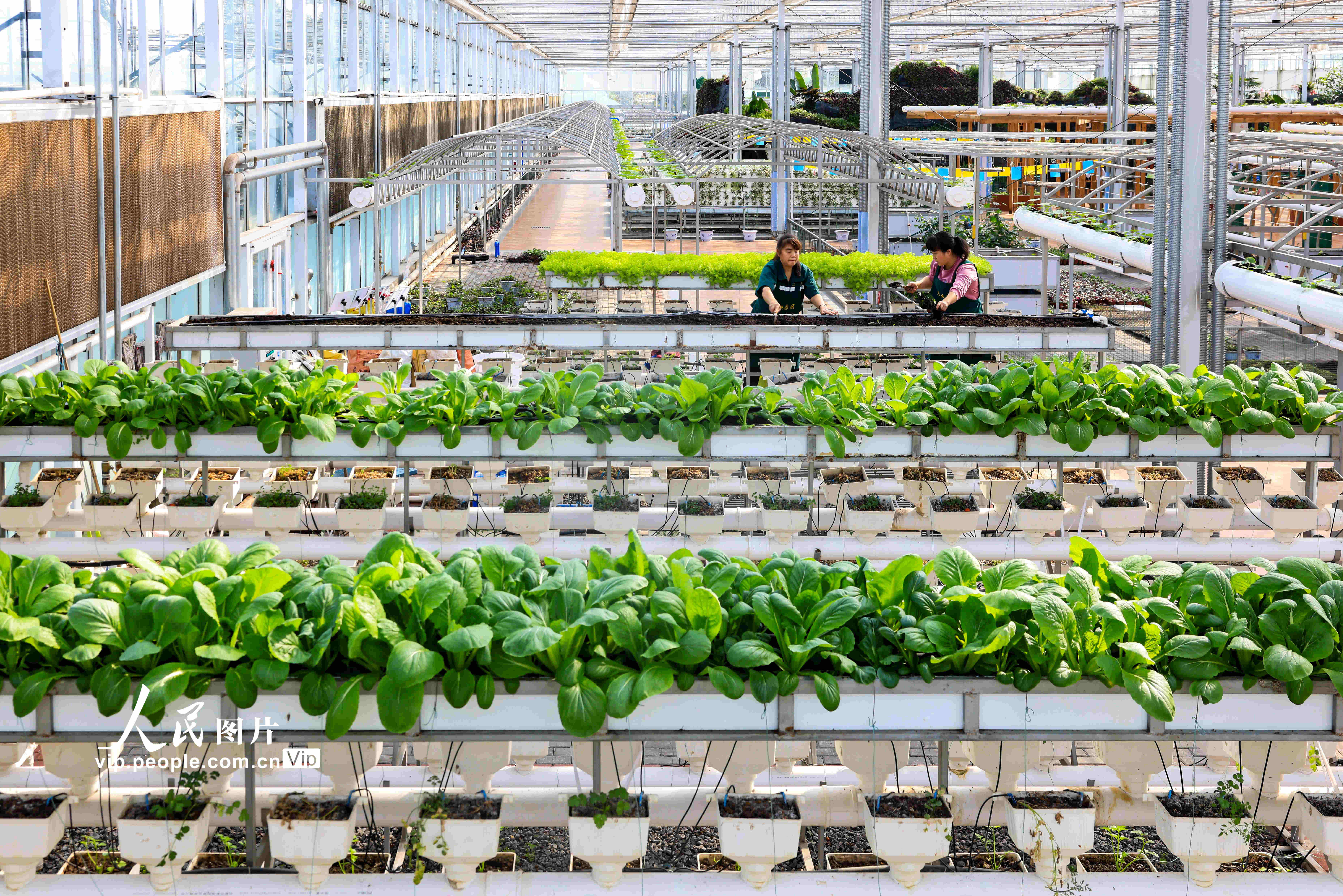 2023年2月26日,在四川省瀘州市江陽區(qū)現(xiàn)代農(nóng)業(yè)園區(qū)的高科技溫室種植大棚內(nèi),工人們忙著養(yǎng)護(hù)栽種的蔬菜。張若涵攝(人民圖片網(wǎng))