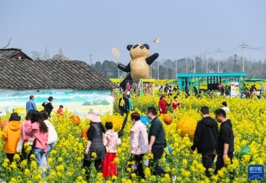 近日,位于四川成都崇州市的數(shù)萬畝油菜花競相綻放,吸引游客前來踏春觀光。