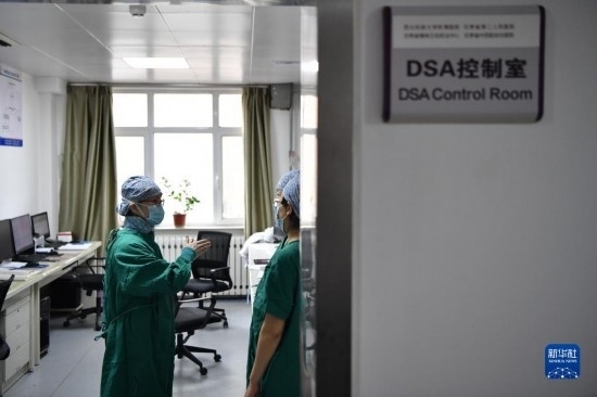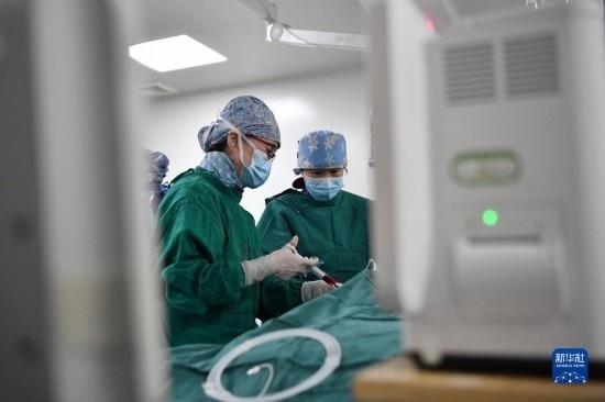 3月7日,馬娜(左)和同事在手術(shù)室為患者進(jìn)行介入手術(shù)治療。