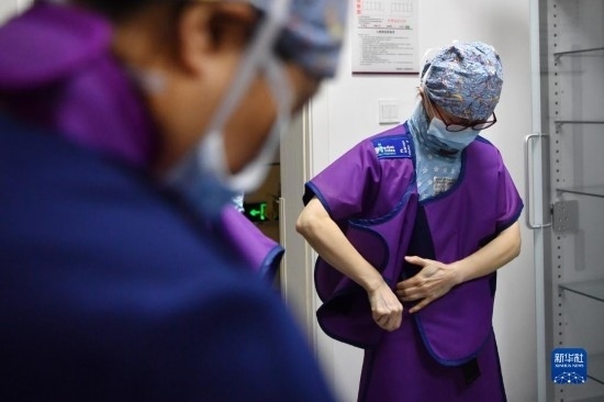 3月6日,馬娜(右)和同事穿上鉛衣準(zhǔn)備手術(shù)。