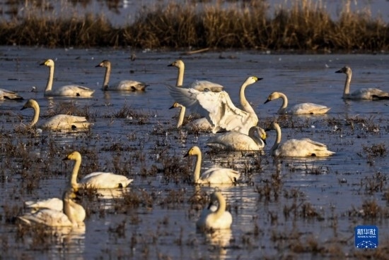 3月20日,在內(nèi)蒙古自治區(qū)呼和浩特市托克托縣黃河沿岸,天鵝在水上棲息覓食。