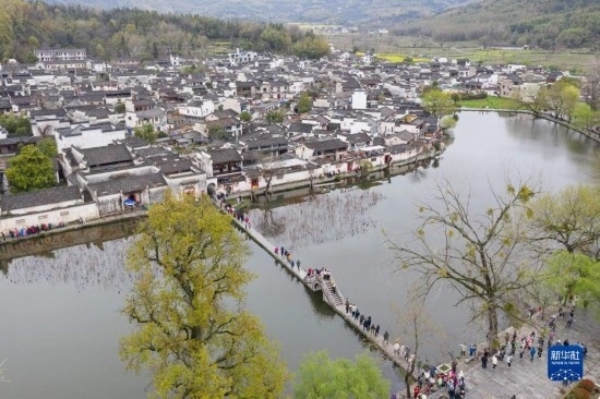 3月24日,游客在黟縣宏村南湖游覽(無人機照片)。